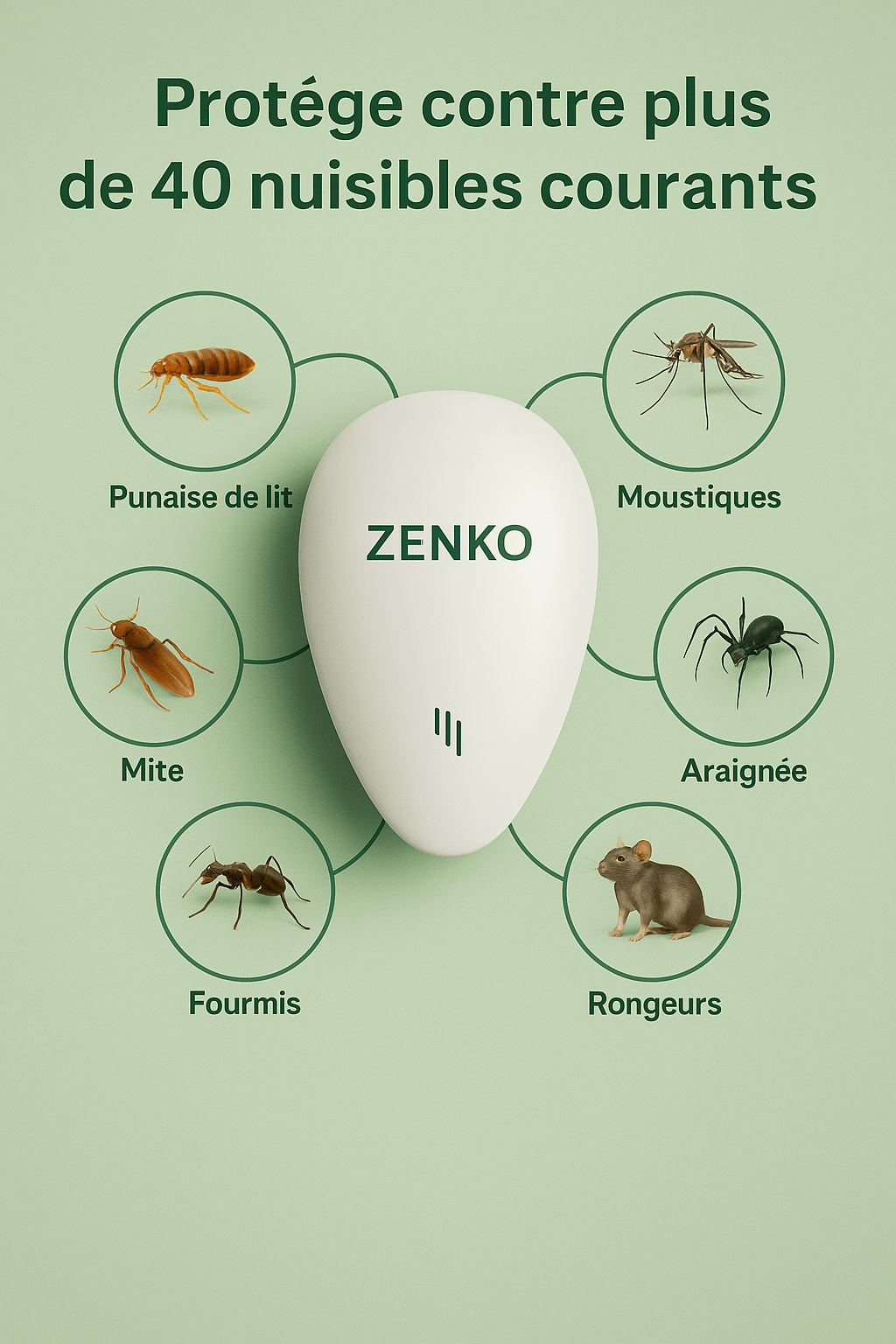 ZENKO™ est un dispositif ultrasonique nouvelle génération conçu pour repousser efficacement plus de 40 types de nuisibles : moustiques, punaises de lit, fourmis, cafards, araignées, rongeurs, mouches, etc.
