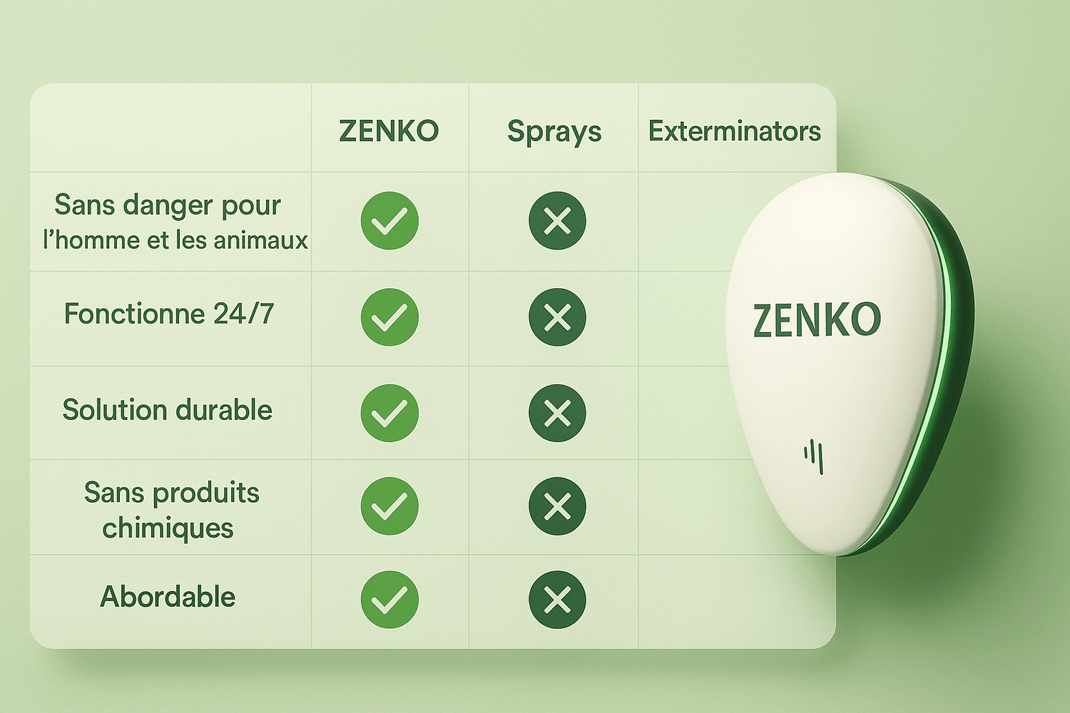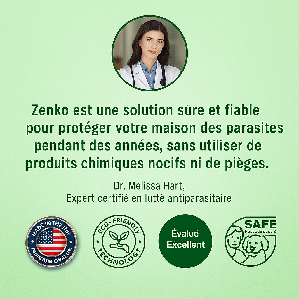 Recommandé par des spécialistes en lutte antiparasitaire, ZENKO offre une protection durable sans produits chimiques, sans pièges et sans danger pour votre famille.